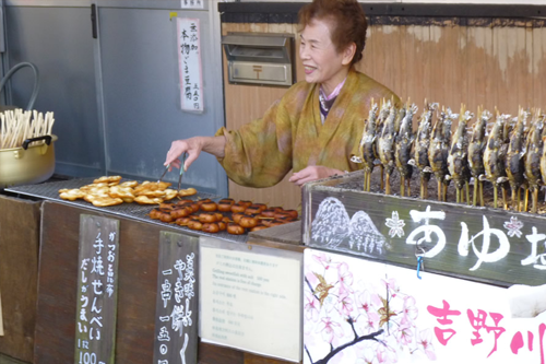 吉野山で創業30年。桜蒸し饅頭や炭火で焼いた鮎の塩焼き